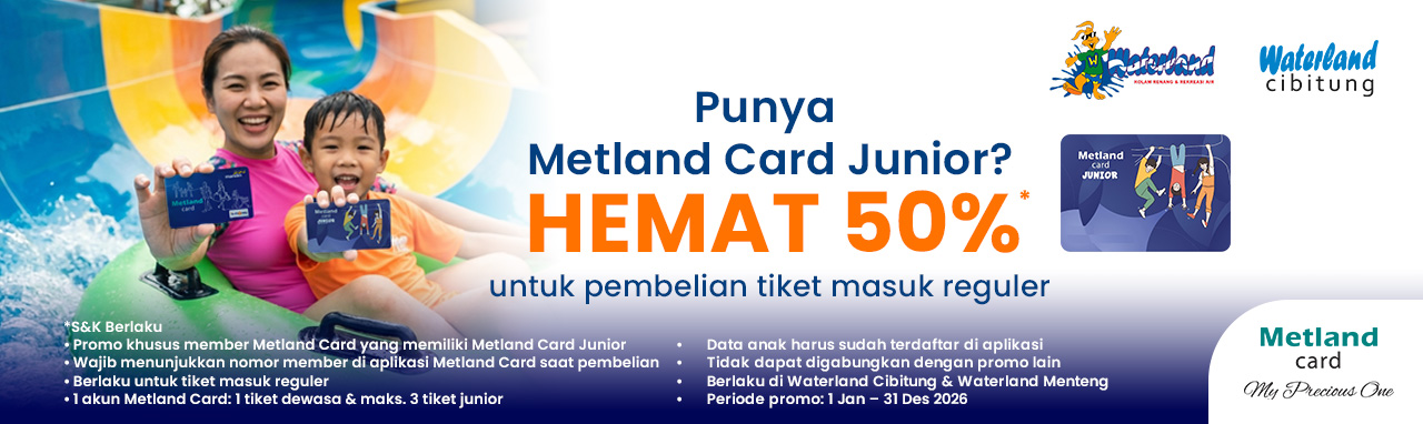 Nikmati DISKON 50% untuk pembelian tiket masuk reguler Waterland Cibitung khusus pemegang Metland Card Junior