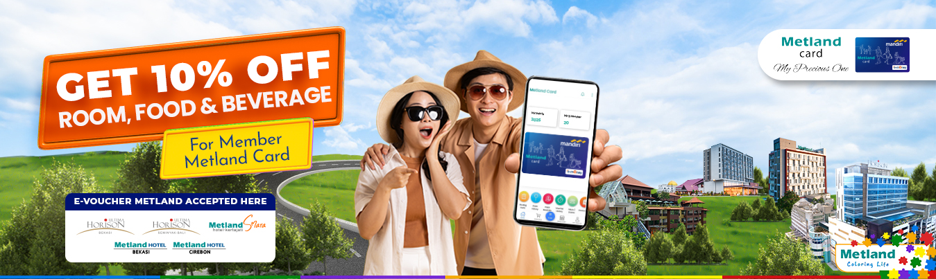 Dapatkan promo spesial member Metland Card “Diskon khusus 10%” untuk Room dan outlet Food & Beverage Metland Hotels Group dengan menunjukkan kartu keanggotaan Metland Card atau aplikasi Metland Card.